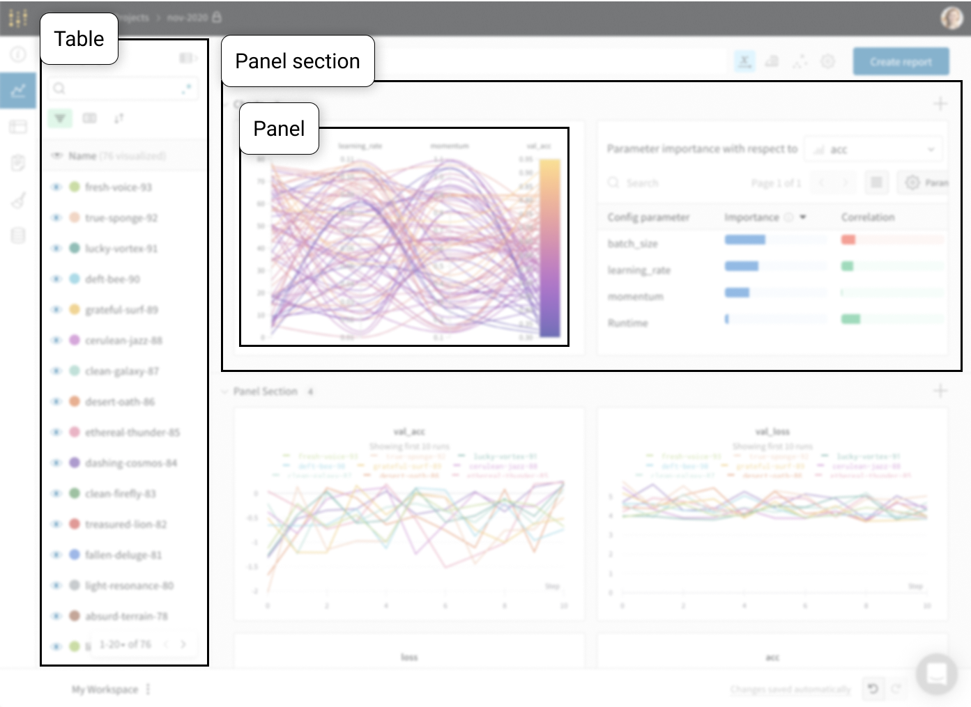 - Tables: プロジェクトに記録されたすべてのRunがプロジェクトのテーブルに一覧表示されます。Runをオンオフしたり、色を変更したり、テーブルを拡張して各Runのノート、設定、およびサマリーメトリクスを表示することができます。